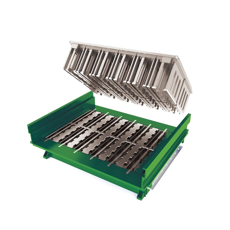 Miezul matriței suferă un tratament termic de cementare, iar placa de suspendare este realizată din oțel Hardox, asigurând rezistență la uzură și funcționare stabilă pe termen lung.